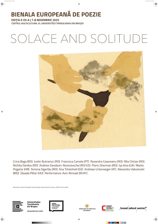 În zilele de 7 și 8 noiembrie 2025, între orele 17.00 și 21.00, vă așteptăm la Centrul Multicultural la a șaptea ediție a Bienalei europene de poezie organizate de Facultatea de Litere a Universității Transilvania, intitulată Solace and Solitude.