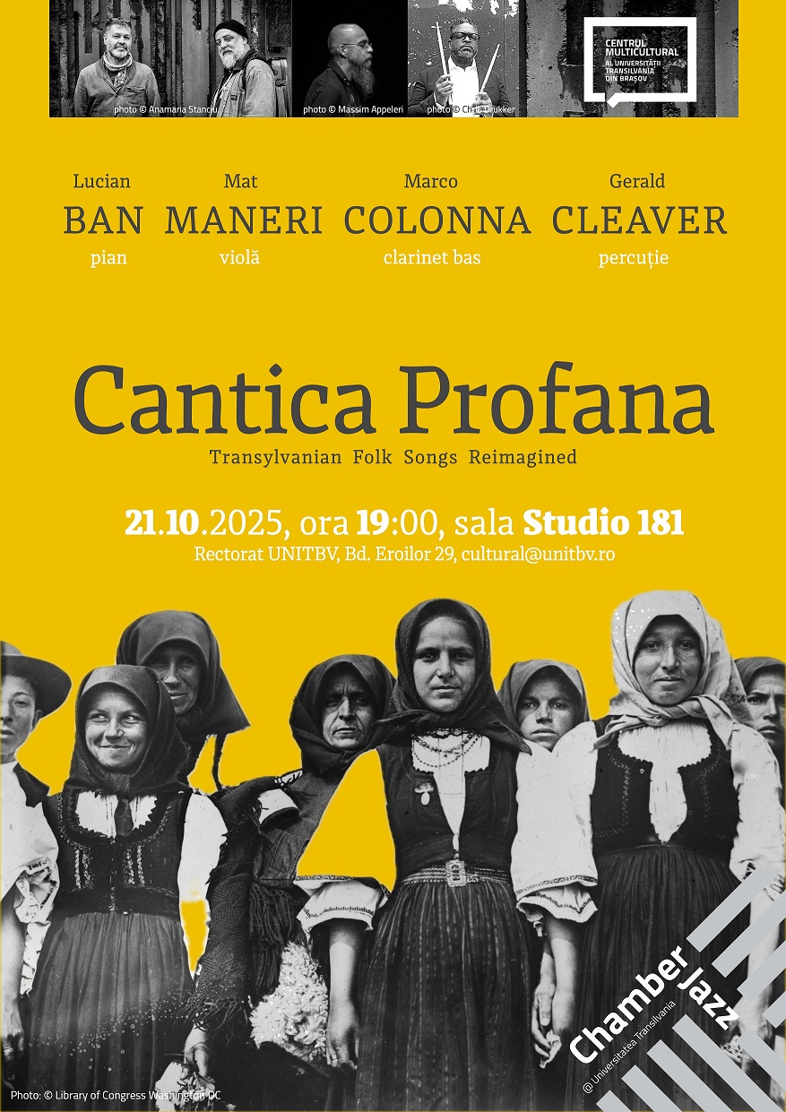 Vocile țăranilor înregistrați de Béla Bartók în urmă cu mai bine de o sută de ani în satele din Transilvania se vor auzi la Chamber Jazz, reimaginate prin jazz de un quartet de muzicieni improvizatori de prim rang. Pianistul româno-american Lucian Ban, originar din Cluj, și violistul american Mat Maneri i-au invitat pe clarinetistul italian Marco Colonna și pe unul dintre cei mai importanți bateriști de jazz contemporani, americanul Gerald Cleaver, să li se alăture pentru ca împreună, pe parcursul unei rezidențe de 5 zile în inima Transilvaniei, să redescopere prin jazz și improvizație esența cântecelor culese de celebrul compozitor. După premiera la Filarmonica din Cluj în cadrul Festivalului Toamna Muzicală Clujeană, cei patru muzicieni vor ajunge la Brașov pentru un concert eveniment pe 21 octombrie.